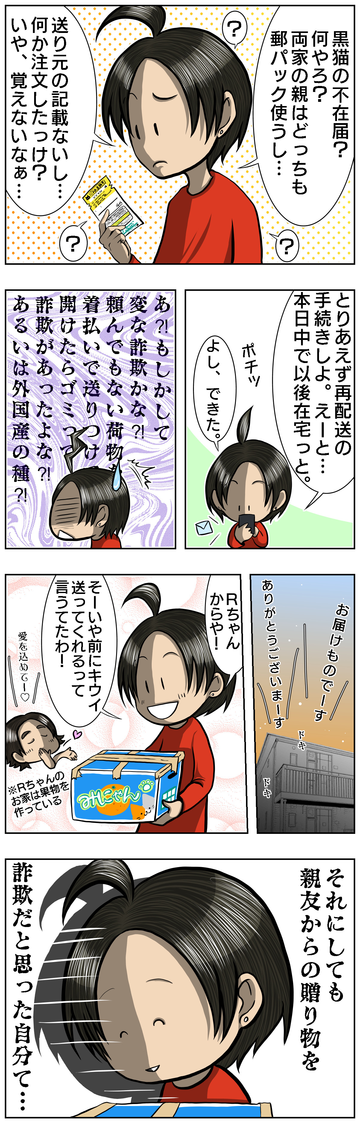 2020年11月27日 疑心暗鬼の不在票 Rちゃんごめん! そしてありがとう! 見て見て!このキウイとみかんを! 特にみかんが! もうみかんが美味しすぎて! めっちゃ甘い〜(*´ω`*) 幸せ〜 もちろんキウイも美味しい! ちょっとお裾分けしてもまだまだあります! のり三、みかんは「うまい」と食べてます。 キウイはアレルギー(本人談)があるので食べれない。 そもそも(痒くなるので)キウイは好きでもない様子。 つまり、 私が独占! ヒャッホイ!!! 届いてから毎日食べてる! NOフルーツ、NOライフ! ではでは〜またお会いしましょ♪ 人気ブログランキングに参加していますよろしければ下記バナーをポチッとお願いします!人気ブログランキング のり三、キウイもダメだがコレもダメ。